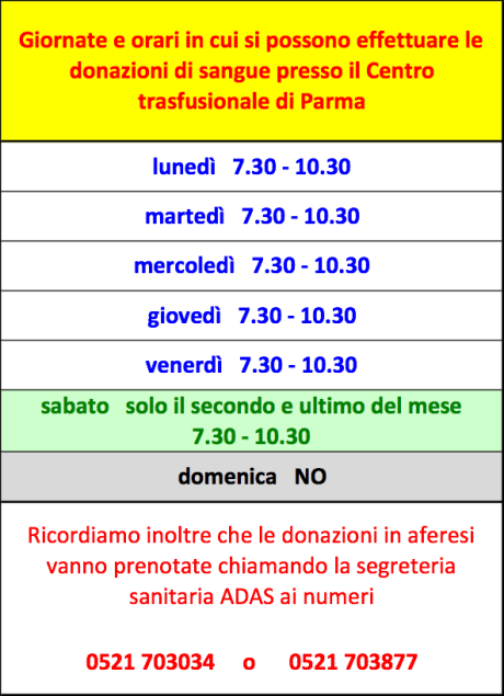 ORARI DI PRELIEVO DEL CENTRO TRASFUSIONALE Pubblicato dalolloforno26 aprile 201526 febbraio 2021Pubblicato in: Donazione di sangue, Senza categoriaTag:donasangue, donazione, Fidas, Fidas Schiaffino, oggidono Condividi: Condividi su WhatsApp (Si apre in una nuova finestra) WhatsApp Condividi su Facebook (Si apre in una nuova finestra) Facebook Stampa (Si apre in una nuova finestra) Stampa Email a link to a friend (Si apre in una nuova finestra) E-mail Mi piace Caricamento...