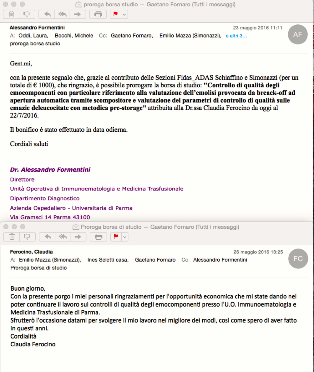 L’Adas Schiaffino ha contribuito al sostenimento della borsa di studio in favore della Dr.ssa Claudia Ferocino, ricercatrice dell’Unità Operativa di Immunoematologia e Medicina Trasfusionale dell’Azienda Ospedaliero – Universitaria di Parma
