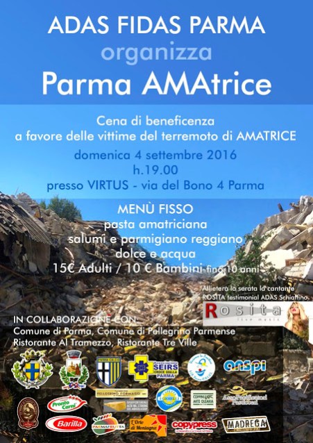 Domenica 4 settembre, presso la Virtus di Via Del Bono, 4 a Parma, l’ADAS FIDAS Parma ha organizzato una cena benefica il cui ricavato servirà per aiutare le popolazioni recentemente colpite dal terremoto di Amatrice e dintorni. La collaborazione del Comune di Parma, di quello di Pellegrino Parmense, dei Ristoranti “Al Tramezzo” e “Tre Ville”, del Parma Calcio 1913 e di tante ditte di Parma e provincia, hanno permesso di realizzare in tempi strettissimi questo evento al quale chiamiamo la generosa gente di Parma a partecipare.
