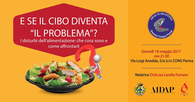 Nell’ambito delle manifestazioni per divulgare la cultura del dono del sangue e per tutelare la salute dei donatori, l’Adas Schiaffino propone questa “serata salute” nella quale la Dott.ssa Lorella Fornaro, Psicologa – Psicoterapeuta, responsabile del Centro AIDAP di Parma, specializzato nella cura dei disturbi dell’alimentazione e dell’obesità, spiega che cosa sono questi disturbi e come affrontarli.