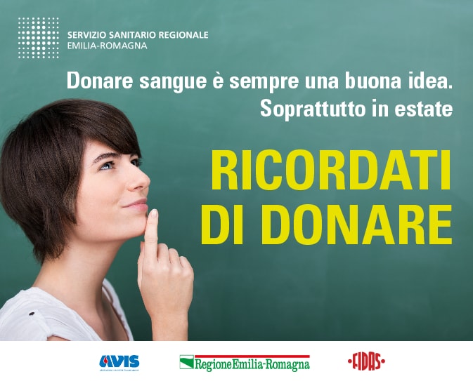 “Donare sangue è sempre una buona idea, soprattutto in estate. Ricordati di donare”. È lo slogan, declinato via sms, email e su manifesti, locandine e banner, della nuova campagna di comunicazione estiva di Regione Emilia-Romagna, FIDAS e Avis, rivolta ai donatori di sangue perché facciano una donazione prima o dopo le vacanze. D’estate, infatti, il bisogno aumenta, anche in forza del flusso di turisti presenti sul territorio e per i frequenti eventi di forte richiamo e aggregazione, come festival e concerti.