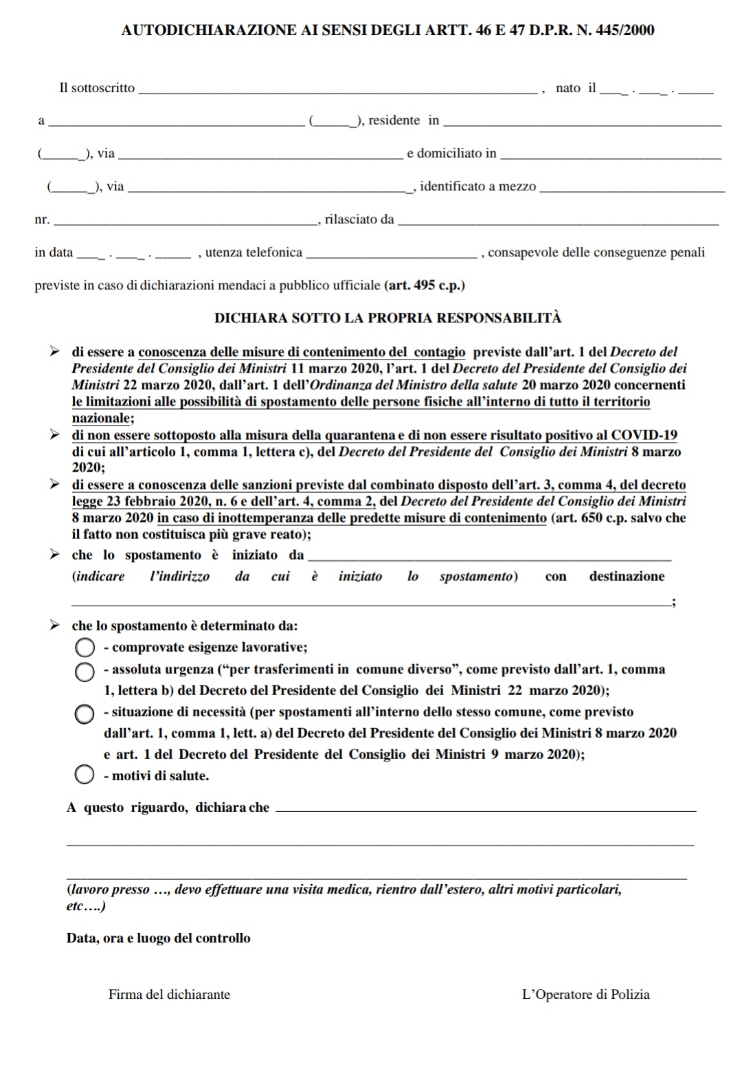“Facendo seguito al Decreto del Presidente del Consiglio dei Ministri del 9 Marzo 2020 riguardo le ulteriori misure urgenti in materia di gestione dell’emergenza epidemiologica da COVID-19 in Italia, […] allo scopo di contrastare e contenere il diffondersi del coronavirus, estende all’intero territorio nazionale le misure del D.P.C.M. che prevedono di evitare ogni spostamento delle persone fisiche in entrata e in uscita dai territori, nonchè all’interno dei medesimi territori, salvo che per gli spostamenti motivati da comprovate esigenze lavorative o situazioni di necessità, ovvero spostamenti spostamenti per motivi di salute”.