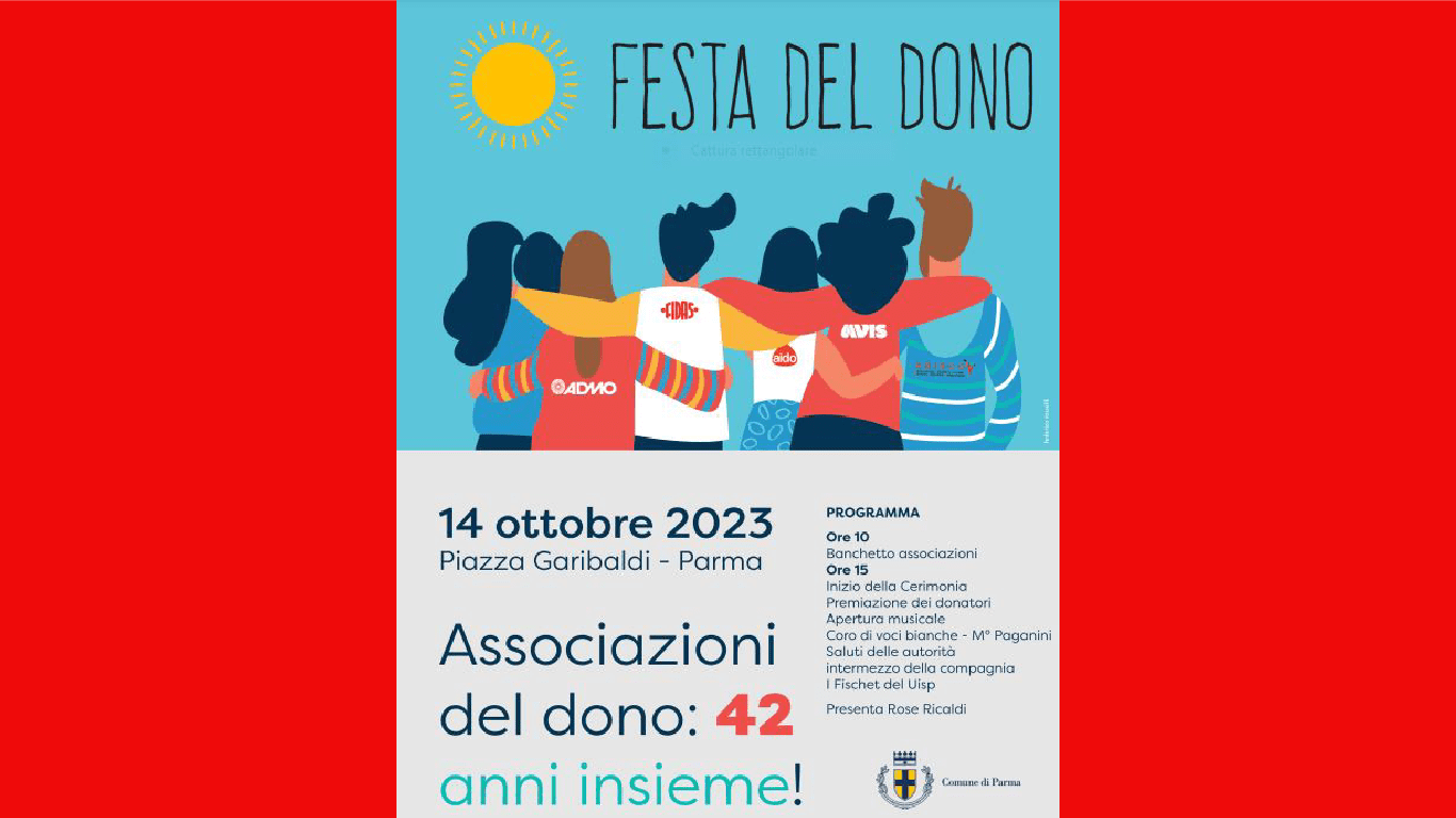 Sabato 14 ottobre, sotto i Portici del grano, in Piazza Garibaldi, a Parma, si è svolta la 42^ edizione della festa del dono, voluta dal Comune di Parma e dalle associazioni del dono della città (Admo, Adisco, Aido, Avis e Fidas). La manifestazione, presentata da Rose Ricaldi, dopo gli interventi delle autorità, tra le qualiContinua a leggere “42^ FESTA DEL DONO”