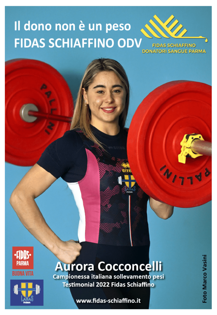 Prima di diventare Testimonial di Fidas Schiaffino, Aurora Cocconcelli è prima di tutto una donatrice di sangue. Campionessa italiana di sollevamento pesi, Aurora ha deciso di dire a tutti quanto la donazione del sangue non sia un peso, bensì un atto di amore verso il prossimo totalmente gratuito e incondizionato. Insieme al suo Coach, Paolo Gallarotti, e al gruppo LABAS Parma si reca periodicamente a donare sangue. In questo ha coinvolto anche la sua famiglia, in primis la sorella e con lei altri amici. Come sempre, un grande in bocca al lupo ad Aurora per la sua carriera sportiva e.. alla prossima donazione!